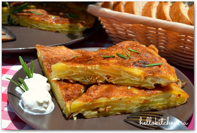 18. Тортилья получилась вкусная, сочная, с запахом прожаренного лука и картошки, согласитесь, это очень домашний запах! Она хороша как на завтрак, так и на обед. Подавать можно со сметаной и зеленью, а так же бокал красного холодного вина украсит этот обед в жаркий летний день.