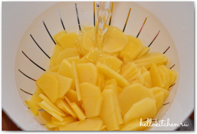 3. Ополаскиваем картофель водой, чтобы смыть крахмал. Так картофель не будет слипаться при жарке.