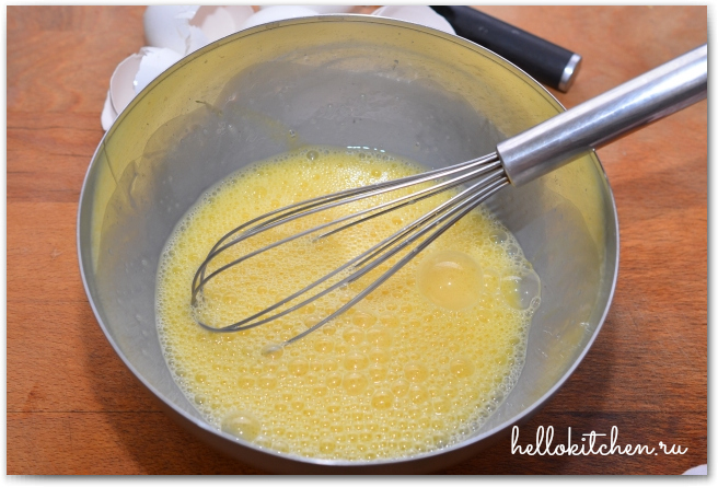 13. Выкладываем получившуюся массу на сковороду. Если вы не уверены, в том что омлет может пристать к сковороде, и потом плохо преревернуться и разломаться, то лучше быстро помыть сковороду перед тем, как выкладывать массу, и заново смазать растительным маслом. Я так и сделала, хотя в предыдущий раз этого не понадобилось.