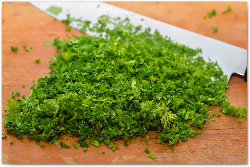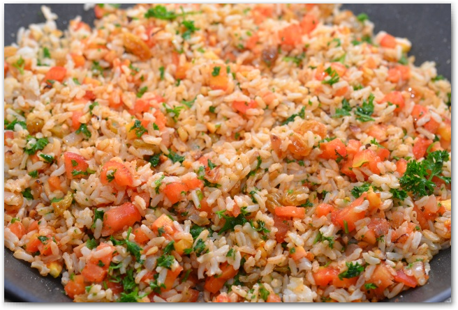 9. Добавляем рис, изюм, петрушку. Убавляем огонь до минимума. Хорошо перемешиваем. Обычно я использую коричневый рис, но белый длинозёрный тоже прекрасно подойдёт.