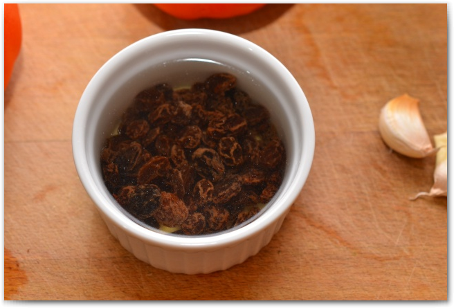 4. Изюм также заливаем кипятком, даём ему постоять минут 5, сливаем воду.