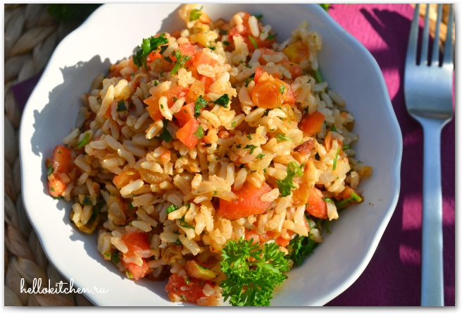 11. Всё! Великолепный гарнир готов. Вкус получается очень богатый и разнообразный. С этим блюдом можно так же бесконечно импровизировать, добавляя или убавляя те или иные продукты. Готовила этот рис уже несколько раз, я в полном восторге, поэтому решила поделиться рецептом с вами. Надеюсь, у вас тоже приживётся столь необычный гарнир из риса.