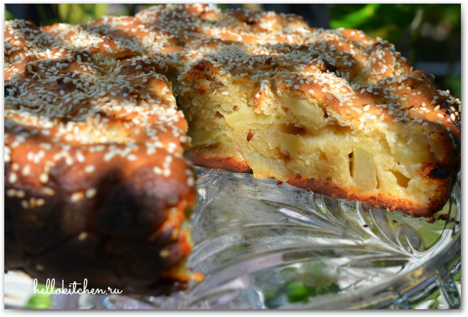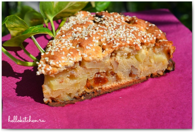 За основу этого рецепта я взяла рецепт творожного кекса. Но у меня было чуть больше творога, около 350 гр, и 5 яблок, так что я увеличила количество муки до 200 гр, и разрыхлителя 1 ч.л., яблоки нарезала пластинками и обваляла в муке, добавила их в конце. Ах да! Ещё добавила горсть изюма, горсть грецких орехов и чайную ложку семечек льна, и посыпала сверху семечками кунжута. Получился совсем другой рецет, уже не кекса, а великолепного домашнего пирога. Много яблок, много творога, всё как я люблю!