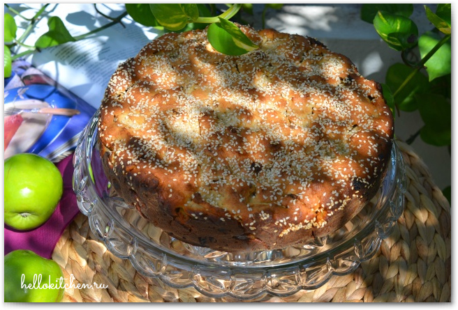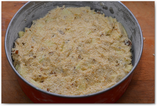 17. Выкладываем получившееся тесто в форму, сверху посыпаем кунжутом, если есть. Жареный кунжут очень богат калием, который необходим, для того чтобы кальций хорошо усваивался организмом. Полезный пирог получается! Ставим пирог в разогретую духовку на 40-50 минут, в зависимости от вашей духовки.
