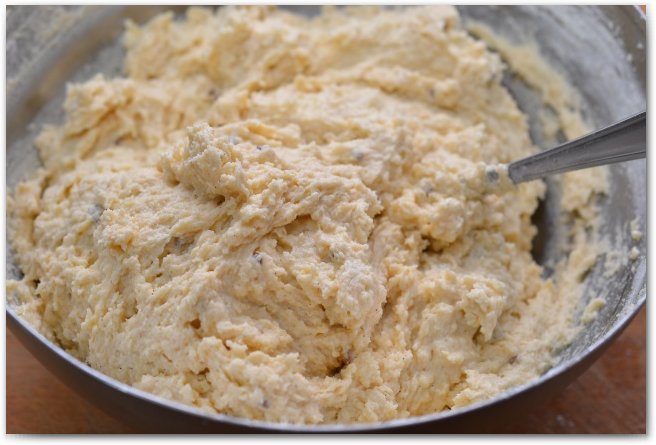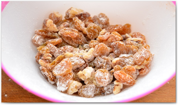 14. Обваливаем изюм и орехи в муке. Добавляемв тесто, хорошо вымешиваем.