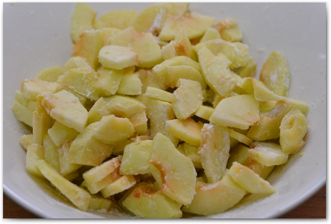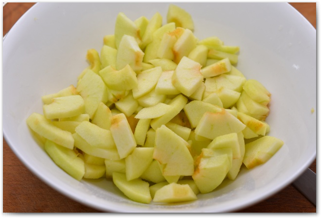 2. Яблоки нарезаем пластинками, сбрызгиваем лимонным соком, чтобы яблоки не потемнели, хорошо перемешиваем, и убираем в сторону.