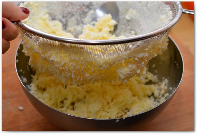 4. В масляную смесь, через сито, протираем творог.