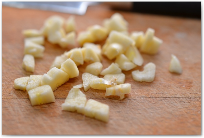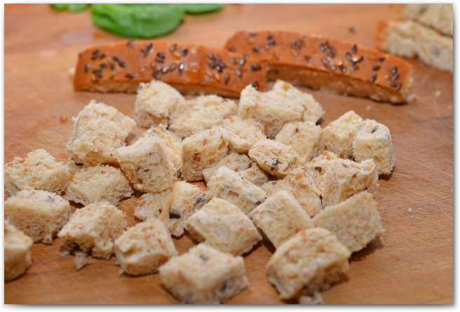 3. Нарезаем хлеб кубиками. В рецепте указан белый хлеб, но я использовала свой любимый, цельнозерновой с льном.