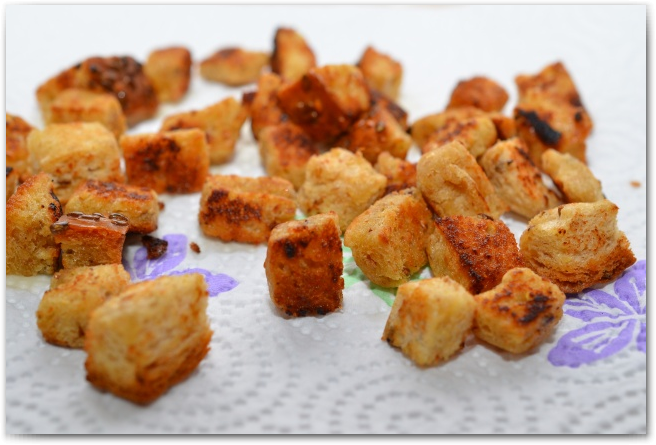 4. Обжариваем кубики хлеба в 1 ст.л. оливкового масла до золотистой корочки, затем перекладываем на бумажное полотенце, чтобы впитался лишний жир.