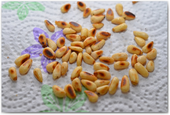 5. Слегка обжариваем кедровые орехи в той же сковороде. Перекладываем их на бумажное полотенце. У меня не было кедровых орехов нужного количества, поэтому я смело добавила грецких. Получилось 50/50.