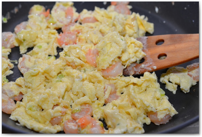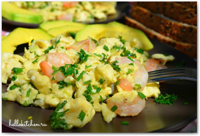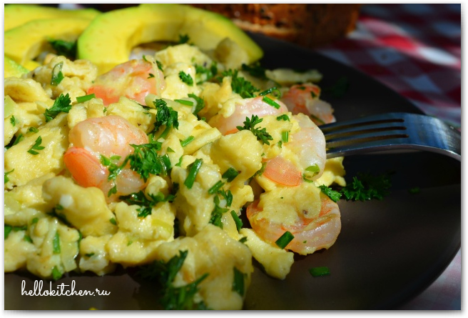 7. Увеличиваем огонь до максимума и выливаем в сковороду яйца. Всё время активно перемешиваем их лопаткой, чтобы они не успевали схватиться и поджариться, так яйца остануться нежные и воздушные. Как только яйца готовы, сразу же снимаем с огня, добвляем зелень, перемешиваем и перекладываем на тарелки.