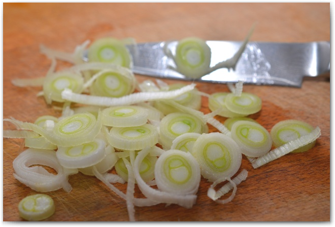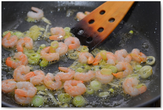 2. Для начала подготовим все продукты. У меня были замороженные коктейльные креветки, я обдала их кипятком и почистила от хвостиков. Дала стечь воде. А пока нарезаем мелко белую часть зеленого лука. Если у вас лук был без белой части, можно использовать кусочек лука порея, белую его часть, как это сделала я.