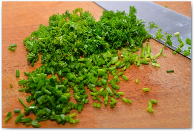 3. Мелко нарезаем петрушку и зеленый лук (всю зелёную его часть). Должно получиться примерно 3 ст.л. зелени.