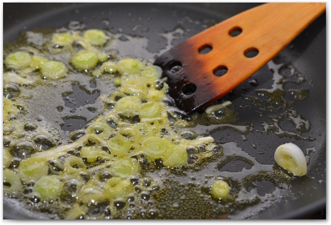 5. Добавляем лук (белую часть), обжариваем примерно 30 секунд.