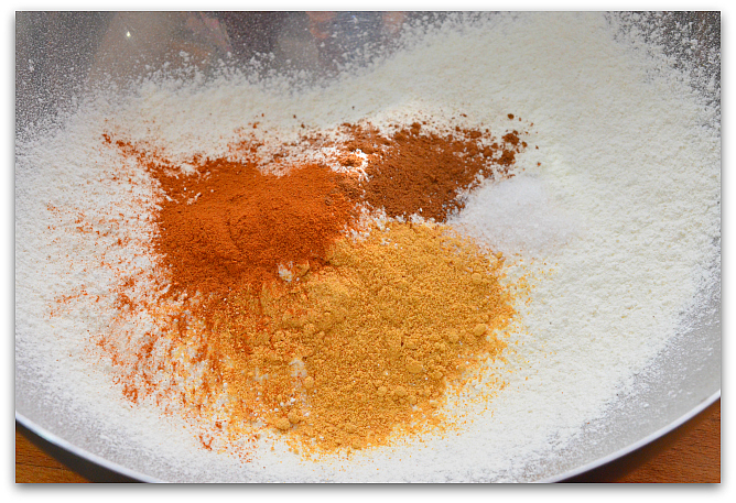 Просеиваем муку в большую миску, добавляем имбирный порошок, соду, корицу, соль, смесь приправ и сахар.