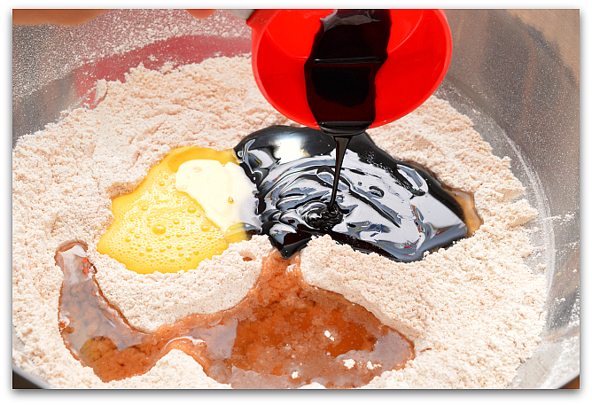 3. В мучную смесь добавляем слегка взбитое яйцо, масло и мелассу.