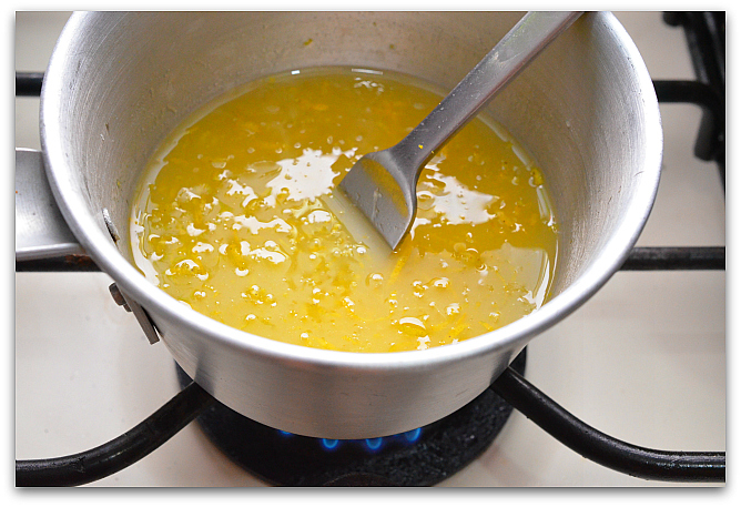 7. А пока кекс выпекается, займёмся глазурью. Заливаем сахарную пудру апельсиновым соком (в оригинале рецепта лимонный сок), добавляем цедру и слегка нагреваем на медленном огне, постоянно помешивая, нам надо, чтобы сахарная пудра полностью растворилась. Не перегрейте! Надо лишь слегка подогреть.