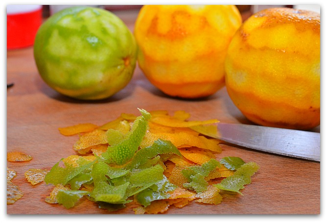 1. Острым ножом снимаем цедру с двух апельсин и половины лимона. Стараемся снять кожицу аккуратно, чтобы не было белой части, которая сильно горчит.