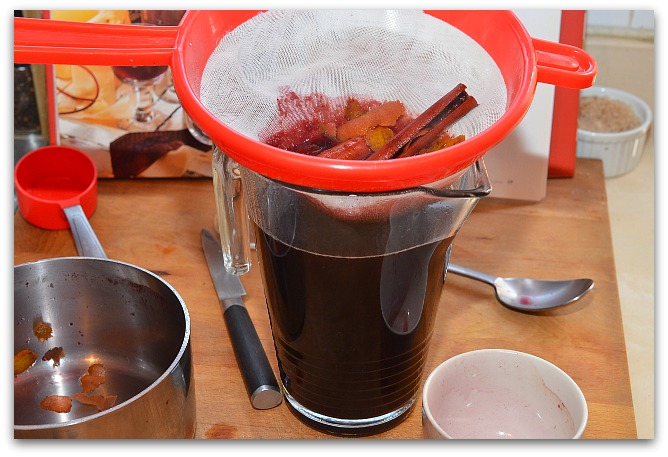 3. Процеживаем вино через марлю в кувшин. Перед подачей глинтвейн можно снова слегка подогреть, чтобы напиток был горячий.