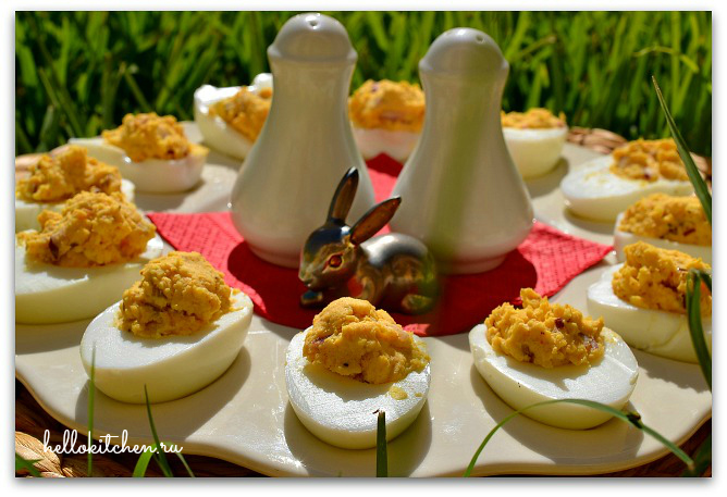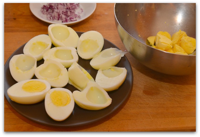 1. Разрезаем яйца пополам, аккуратно чайной ложечкой вынимаем желток.