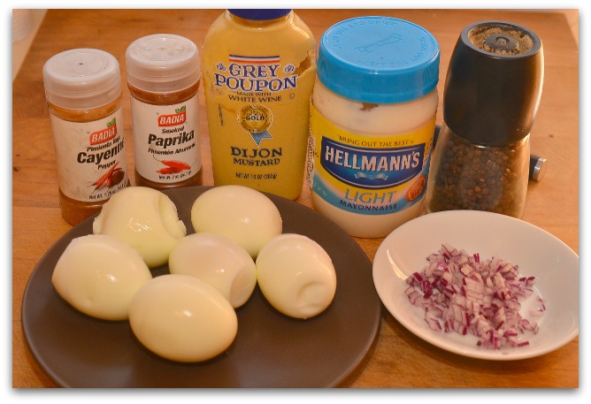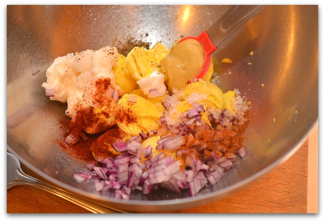 2. В миске смешиваем желтки, горчицу, лук, табаско, соль, перец, паприку и майонез. Майонез лучше брать самый лёгкий (light), а все специи добавляем по вкусу. Аккуратно! Не пересолите, так как и майонез и горчица солёные.