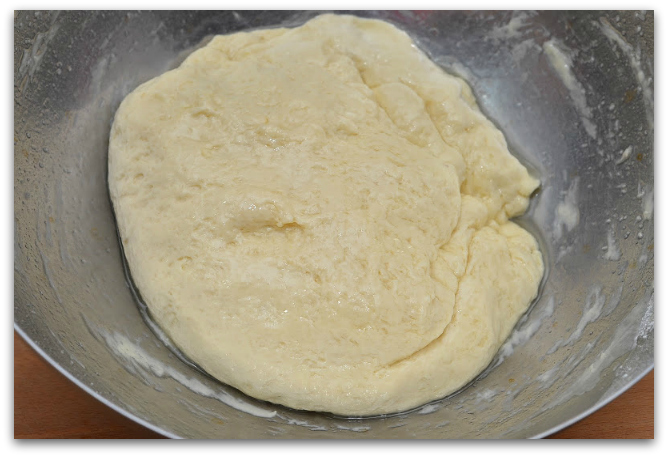 14. Обминаем тесто и тщательно вымешиваем. На ощупь почувствуете, что тесто стало как будто легче и более упругим, очень приятным на ощупь.