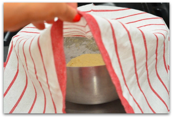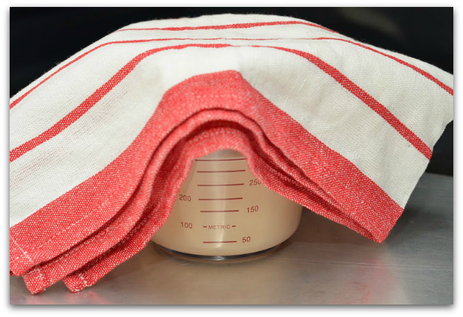 12. Накрываем чашку с тестом льняным полотенцем и ставим в тёплое место где нет сквозняков. В моём случае это на дверку духовки. Оставляем тесто на 1 час.