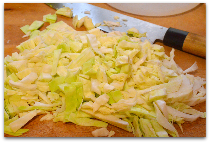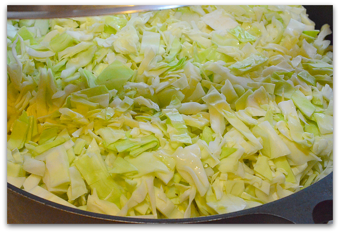 17. Разогреваем масло на сковороде, добавляем капусту, солим, хорошо перемешиваем, накрываем крышкой и тушим на слабом огне, пока капуста не станет мягкой.