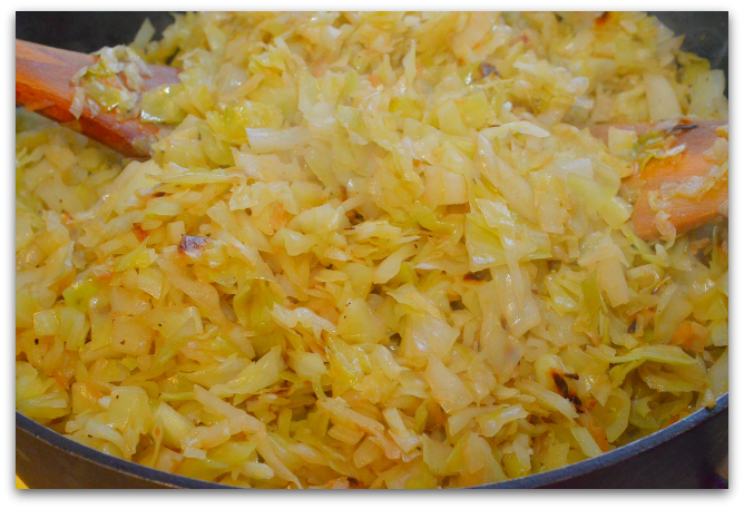 18. Снимаем крышку, увеличиваем огонь и поджариваем капусту, чтобы она стала золотистого цвета. Остужаем.