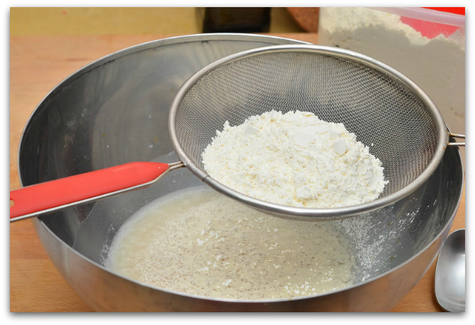 5. Набираем первую чашку муки и аккуратненько через сито высеиваем её на опару.