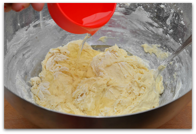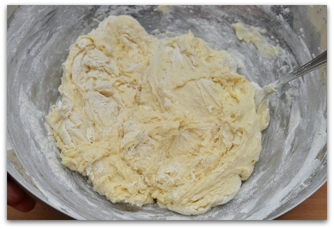 8. Просеиваем в тесто третью чашку муки. Тут уже становится тяжелее вымешивать вилкой. На этом этапе тесто становится сухое, крутое и вообще кажется, что муки уже много. Должно получиться вот что:
