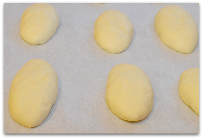 20. Тесто, конечно, оседает, но не очень сильно. Вытягиваем тесто в длину. Острым ножом разрезаем тесто на 16 ровных частей и формируем шарики. Накрываем полотенцем и даём постоять минут 5-10.