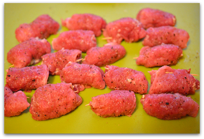 7. Заворачиваем мясо рулетиком, скрепляем зубочисткой.