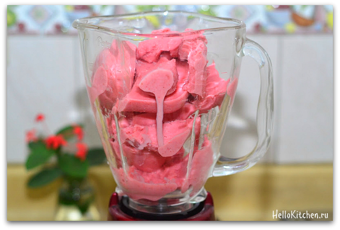 5. Через 2 часа достаём смесь, она должна замерзнуть по бокам и начать схватываться в середине. Загружаем её в блендер, взбиваем, и снова убираем в морозилку на 2 часа.