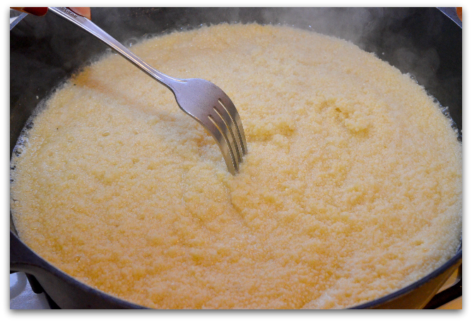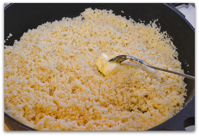 3. Нагреваем сковороду, смазываем сливочным маслом. Высыпаем кус-кус и заливаем горячей водой. Делаем средний огонь и начинаем вилкой (именно зубчиками вилки) смешивать крупу с водой.