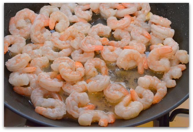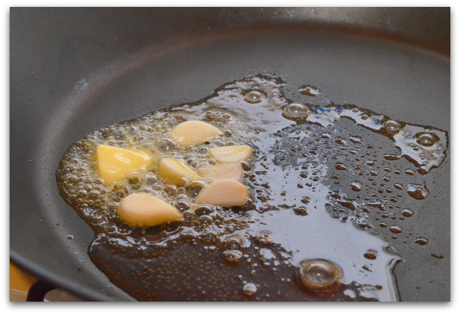 7. А теперь займёмся креветками. В сковороде на большом огне в оливковом масле растапливаем сливочное. Добавляем чеснок, жарим примерно 30 секунд.
