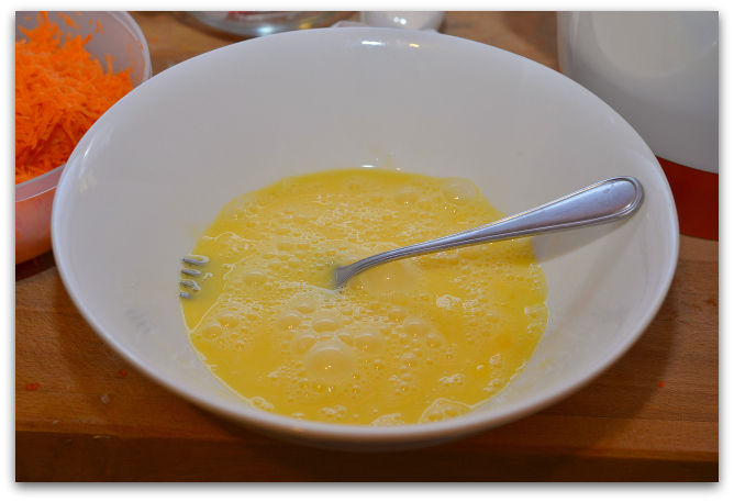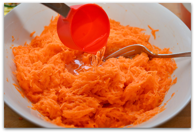 4. Смешиваем яйца и морковь. Добавляем растительное масло. Перемешиваем. Лучше всего использовать какое-нибудь нейтральное масло, без запаха, тогда аромат моркови не будет перебиваться другими ароматами, например подсолнечного масла, у меня было масло канолы.