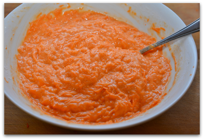 5. Соединяем сухие ингредиенты и жидкие: мучную смесь с яично-морковной. Хорошо перемешиваем.