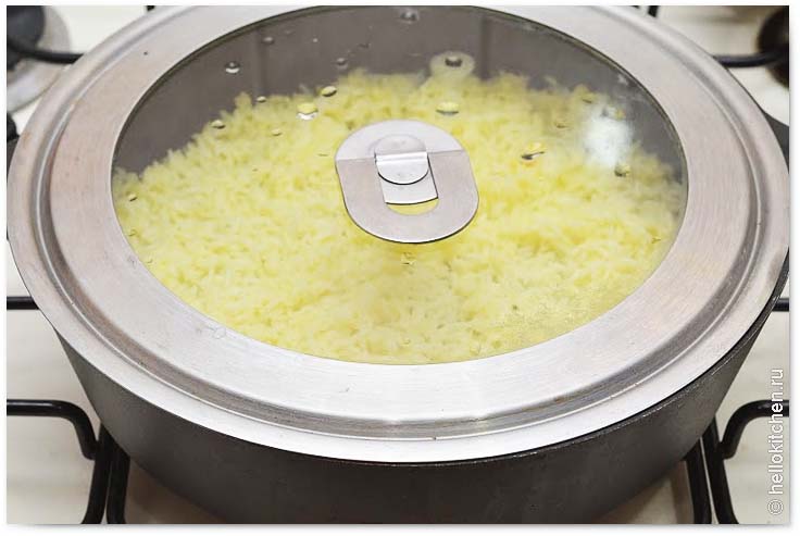 12. Готовый рис должен получится очень рассыпчатым, но полностью приготовленным, не должно быть сухих рисинок или разварившихся, также, он не должен пригореть ко дну сковородки; проверяем на готовность. Если ещё не совсем готов, снова добавляем немного воды (буквально, столовую ложку горячей воды) и накрываем крышкой ещё минуты на 3-4. В нашем деле, главное — не переварить его.