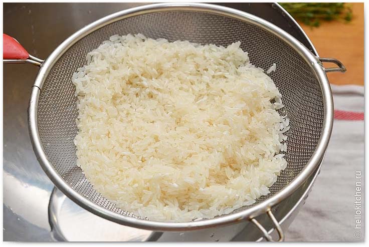 2. Хорошо промываем рис в большом количестве воды, до тех пор, пока вода не станет прозрачная, потом откидываем его на дуршлаг , чтобы стекла вся вода, нам нужен сухой  и чистый рис.