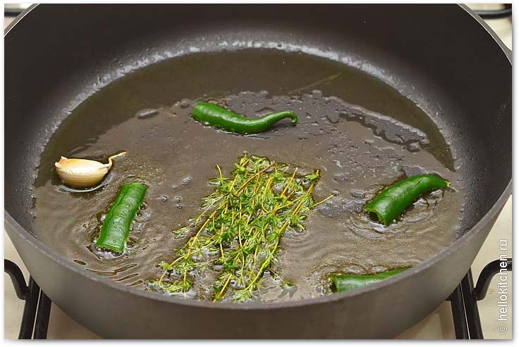 4. Нагреваем масло в сковороде на среднем огне, кидаем туда перчик, неочищенный зубчик чеснока и тимьян. Через минуту выбрасываем перец, потом тимьян и самым последним чеснок.