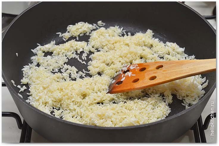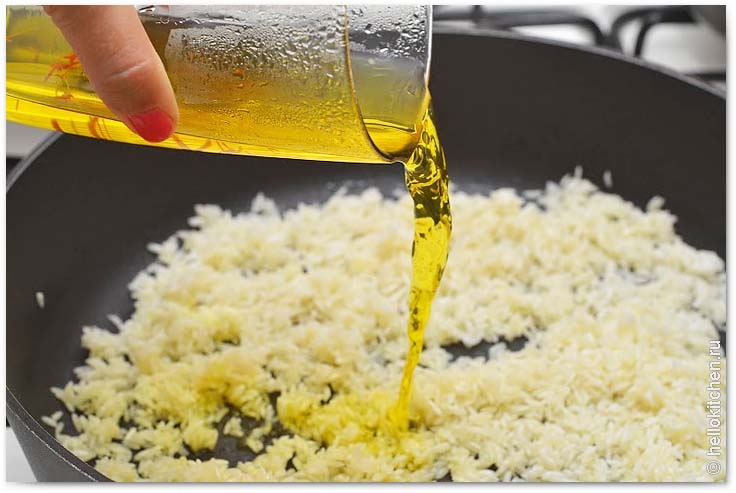 5. Теперь наше масло стало очень ароматное, добавляем туда рис и очень быстро перемешиваем, чтоб рис впитал масло. Буквально 30 секунд.