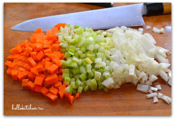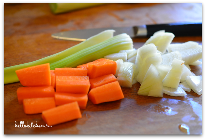 3. А пока, подготовим овощи для супа. Нарезаем морковь, сельдерей и репчатый лук небольшими кубиками.