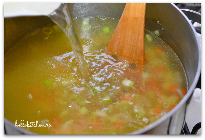 12. Заливаем овощи бульоном. Накрываем крышкой и варим на самом маленьком огне ещё 15 минут.