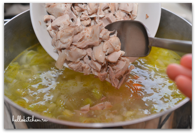 13. Добавляем мясо. Солим и перчим по вкусу. Варим еще 5 минут, уже без крышки.