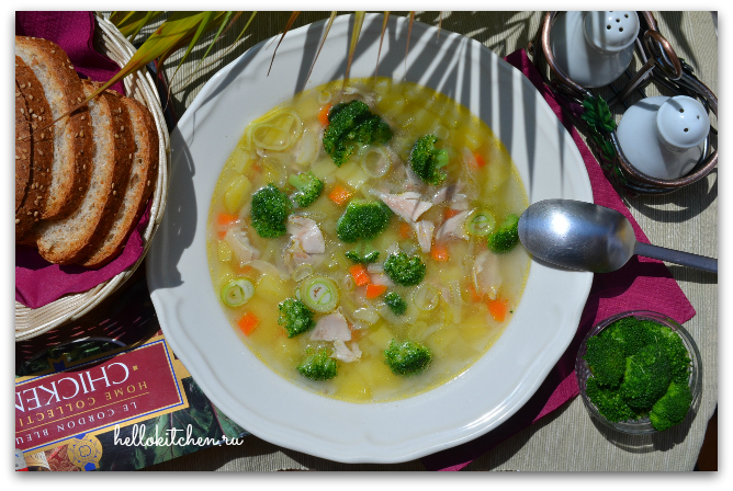Я варю куриный суп по этому рецепту всю жизнь. Но заглянув в книгу Le Cordon Bleu «Chicken», обнаружила, что метод приготовления такого супа практически ни чем не отличается от моего, в книге лишь добавляют не брокколи, а стручковую фасоль. Мне кажется, будет хорошо и с фасолью, и с брокколи, а можно добавить и то и то, исключив картофель, тогда будет супер диетический вариант. И ещё в рецепте идёт сливочное масло, но я использовала оливковое, но уверена, что вкусно будет и с тем и с тем маслом, тут уже на любителя. Суп получается очень ароматный и наваристый, самое то для лёгкого обеда.