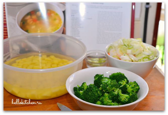 6. Чистим и нарезаем картошку на кубики. Отвариваем брокколи как я показывала в этом рецепте. Овощи готовы. Теперь осталось дождаться, пока доварится бульон.