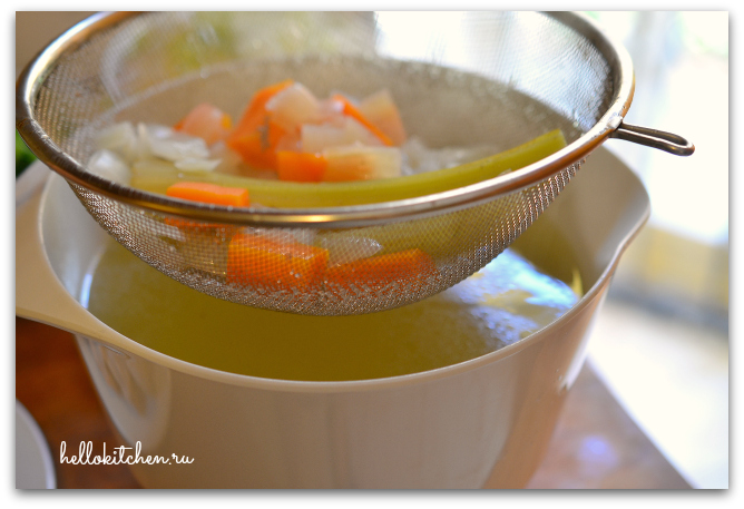 8. Процеживаем бульон сквозь сито. Всё что было в бульоне (овощи, горошеки перца, лавровый лист и сельдерей) выбрасываем.