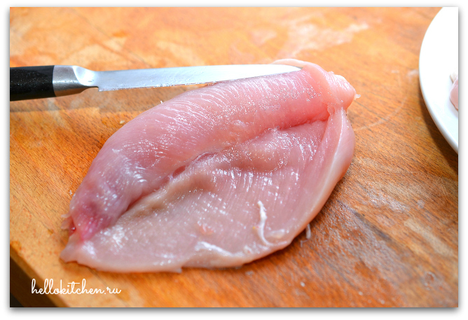1. Острым ножом разрезаем филе посередине; будет удобнее разрезать ровно, если прижмёте филе ладошкой к столу.