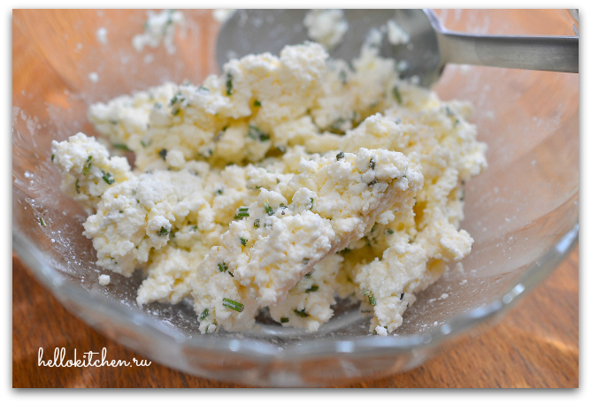 4. А пока делаем начинку. Смешиваем 4 ст.л. рикотты с мелко нарублеными листиками розмарина. Начинку не солим, так как соли, которая в мясе, будет и так вполне достаточно.